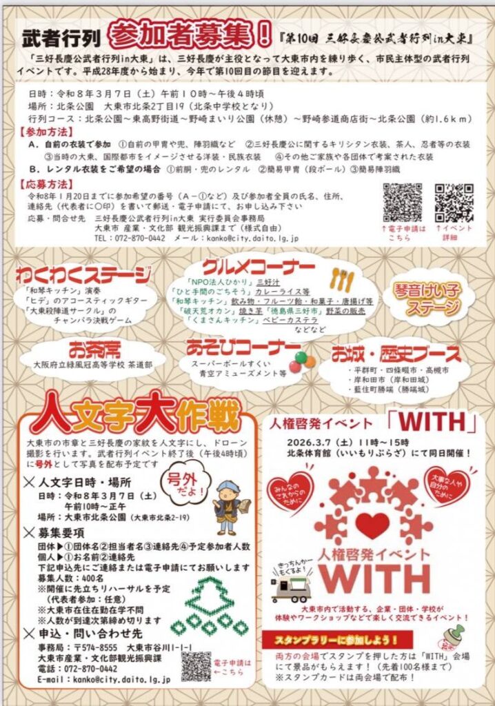 市名と同じ「大東(だいとう)」という姓を持つ方を全国から募集し、行列の先頭を飾る「三好長慶隊」として参加してもらうというもの。 自分の名字がそのまま市の名前、そして行列の主役隊の名前に……。そんな貴重な体験ができるのは、全国の「大東さん」だけの特権です!